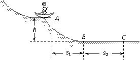 24. (19分)一个质量m=60 kg的滑雪运动员从高h=20 m的高台上水平滑出,落在水平地面上的B点,由于落地时有机械能损失,落地后只有大小为10 m / s的水平速度,滑行到C点后静止,如图所示。已知A与B、B与C之间的水平距离s1=30 m,s2=40 m,g=10 m / s2,不计空气阻力。求: