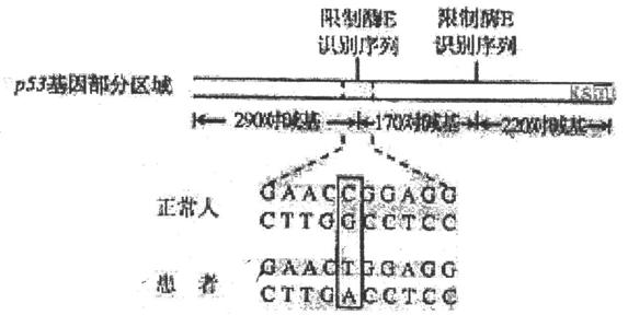 (3)已知限制酶E识别序列为CCG,G,若用限制酶E分别完全切割正常人和患者的 p53基因部分区域(见上图),那么正常人的会被切成 个片段;而患者的则被切割成长度为 对碱基和 对碱基的两种片段。