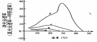 (6)若该细胞为马铃薯,下图中4条曲线(a、b、c、d)为不同光照强度和不同CO2浓度下,马铃薯净光合速率随温度变化的曲线。a光照非常弱,CO2很少(远小于0.03%);b适当遮荫(相当于全光照的1/25)CO2浓度为0.03%,c全光照(晴天不遮荫),CO2浓度为0.03%;d全光照,CO2浓度为1.22%。请据图回答:![]()