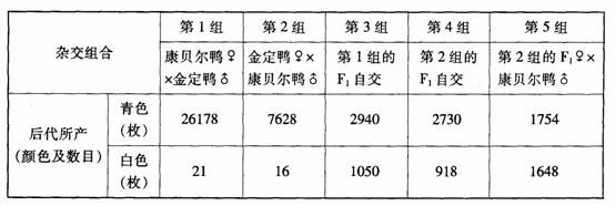 27、 ( 16 分)鸭蛋蛋壳的颜色主要有青色和白色两种。金定鸭产青色蛋,康贝尔鸭产白色蛋。为研究蛋壳颜色的遗传规律,研究者利用这两个鸭群做了五组实验,结果如下表所示。