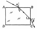 (17分)如图所示,有一块矩形玻璃砖,其折射率为n,有一入射光线从AB表面以α角射入,从BC面射出,射出光线与法线的夹角为β。求:![]()