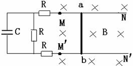 (17分)两根光滑的长直金属导轨导轨MN、M'N'平行置于同一水平面内,导轨间距为l,电阻不计,M、M'处接有如图所示的电路,电路中各电阻的阻值均为R,电容器的电容为C。长度也为l、阻值同为R的金属棒ab垂直于导轨放置,导轨处于磁感应强度为B、方向竖直向下的匀强磁场中。ab在外力作用下向右匀速运动且与导轨保持良好接触,在ab运动距离为s的过程中,整个回路中产生的焦耳热为Q。求: