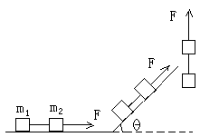 如图所示,质量为m1和m2的两个物体用细线相连,两物体与各接触处动摩擦因数相同,空气阻力不记,在大小恒定的拉力F作用下,先沿水平面,再沿斜面(斜面与水平面成θ角),最后竖直向上运动,则在这三个阶段的运动中,细线上张力的大小情况是( )