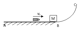 (21分) 如图所示,水平轨道AB与半径为R=360m的光滑圆弧形轨道BC相切于B点,质量为M=0.99kg的木块静止于B点,质量为m=10g的子弹以v0=500m/s的水平速度射入木块而末穿出,若木块与水平轨道间的动摩擦因数为μ=0.5,取g=10m/s2,且已知cos5°=0.966.求:子弹射入后,木块再经过多少时间方可静止?