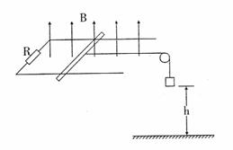 (22分)如图,在竖直向上的匀强磁场中,有两根水平放置的相距为L=0.5m的光滑平行导轨,其左端接一电阻为R=1Ω,将一金属棒垂直导轨放置,用一水平轻绳跨过定滑轮将金属棒与一重物相连接。若重物从距地面h=2m处由静止开始下落,假设在重物落地前,金属棒与重物均已做匀速直线运动。已知:磁感应强度为B=2T,导体棒和重物的质量均为m=0.4kg,不计导轨和导体棒的电阻,不计滑轮的质量和摩擦,重物与地面碰后不反弹,导体棒始终未脱离磁场和导轨g=10m/s2。求:在金属棒开始水平向右运动到静止的过程中