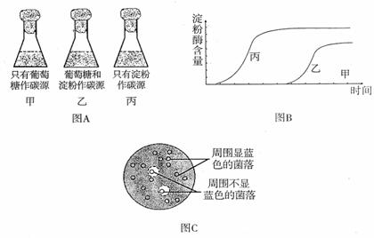 (2)若甲组经过诱变处理,从培养液中也检测出了高活性的淀粉酶。为了筛选其中的这种变异菌株,将诱变后的甲组细菌培养液适当稀释后,转接于 作碳源的固体培养基上培养,得到菌落后用碘液对培养基作显色处理,看到如C图所示情况,图中菌落周围的培养基 色的就是突变菌,此变异应该发生在控制酶合成的基因结构的 区。