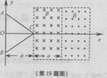 19.如图所示,两个垂直纸面的匀强磁场方向相反,磁感应强度的大小均为B,磁场区域宽度均为a,一正三角形(中垂线长为a)导线框ABC从图示位置方向匀速穿过两磁场区域,以逆时针方向为电流的正方向,关于感应电流/与线框AB边移动距离x的关系,下列图象正确的是