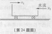 如图所示,质量m=3.0kg的小车在光滑轨道上以速度v1=2.0m/s向右移动。一股水流以v2=2.4m/s的水平速度自右向左射向小车后壁,已知水流流量Q=5.0×10