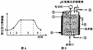 (2)在生产谷氨酸过程中,从放料口取样得知细菌形态各异,pH由7.5降到6.0。此时谷氨酸棒状杆菌正处于图A中[ ] 期;pH降低的原因是 。