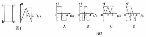 20.矩形导线框abcd放在匀强磁场中,在外力控制下静止不动,磁感线方向与线圈平面垂直,磁感应强度B随时间变化的图像如下图1所示,t=0时刻,磁感应强度的方向垂直纸面向里,在0~4s时间内,线框ab边受力随时间变化的图像(力的方向规定以向左为正方向)可能是下图2中的 ( )
