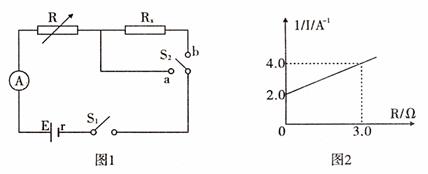 ②该同学已经测得电阻Rx=2.0Ω,继续测电源电动势E和内阻r的阻值,该同不宾做法是:闭合S1,将S2切换到b,多次调节电阻箱,读出多组电阻箱示数R和对应的电流表示数I,由测得的数据,绘出了如图2所示的1/1-R图线,则电源电动势E= v,内阻r= Ω。