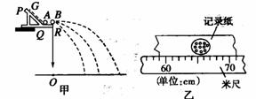 II、某同学用下图所示装置通过半径相同的A、B两球的碰撞来验证动量守恒定律。图中PQ是斜槽,QR为水平槽。实验时先使A球从斜槽上某一固定位置G由静止开始滚下,落到位于水平地面的记录纸上,留下痕迹。重复上述操作10次,得到10个落点痕迹。再把B球放在水平槽上靠近槽末端的地方,让A球仍从位置G由静止开始滚下,和B球碰撞后,A、B球分别在记录纸上留下各自的落点痕迹。重复这种操作10次。图甲中O点是水平槽末端R在记录纸上的垂直投影点。B球落点痕迹如图乙所示,其中米尺水平放置,且平行于C、R、O所在的平面,米尺的零点与O点对齐。