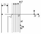 25、(22分)如图所示, 真空中的平面直角坐标系xoy,在-l≤X≤0的区域存在沿y轴正方向的匀强电场,在第Ⅳ象限中存在磁感应强度为B的圆形匀强磁场.一电子(质量为m,电荷量为e,不计重力)在电压为U的电场中从静止加速后,沿x轴方向进入匀强电场。若电子在y轴上的M点进入第Ⅳ象限时,速度方向与y轴负方向成60°角,且经过磁场后能从N点垂直穿过x轴.试求: