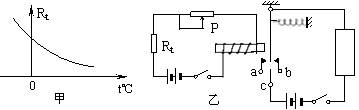 (16分)Ⅰ、(6分)传感器担负着信息的采集任务,在自动控制中发挥着重要作用,传感器能够将感受到的物理量(如温度、光、声等)转换成便于测量的量(通常是电学量),例如热敏传感器,主要是应用了半导体材料制成的热敏电阻,热敏电阻随温度变化的图线如图甲所示,图乙是由热敏电阻Rt作为传感器制作的简单自动报警器线路图。问: