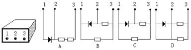 Ⅱ、(10分)①黑箱中有一个理想二极管(正向电阻为零,反向电阻无穷大),还有两个阻值均为1kΩ的电阻,它们与黑箱的接线柱1、2、3接成电路。再用多用电表的欧姆挡对三个接线柱间的电阻进行测量,得到的数据如表格所示。那么黑箱中的线路应该是如图所示电路中的哪一个( )