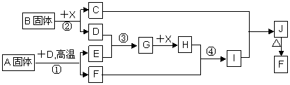 28.(15分)根据下列框图关系填空,已知反应①、③是我国工业生产中的重要反应,X常温下为无色无味透明液体;C焰色反应火焰呈黄色,J为红褐色沉淀;D、E常温下为气体,且E能使品红溶液褪色;A固体中仅含两种元素,其中金属元素的质量分数约为46.7%。