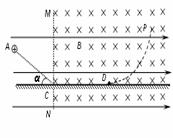25.(20分)如图,空间内存在水平向右的匀强电场,在虚线MN的右侧有垂直纸面向里、磁感应强度为B的匀强磁场,一质量为m、带电荷量为+q的小颗粒自A点由静止开始运动,刚好沿直线运动至光滑绝缘的水平面C点,与水平面碰撞的瞬间小颗粒的竖直分速度立即减为零,而水平分速度不变,小颗粒运动至D处刚好离开水平面,然后沿图示曲线DP轨迹运动,AC与水平面夹角α = 30°,重力加速度为g,求:w.w.^w.k.s.5*