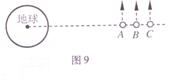 21.如图9所示,在同一轨道平面上的几个质量不等的人造地球卫星A、B、C,均绕地球做匀速圆周运动,它们在某一时刻恰好在同一直线上,下列说法中正确的是