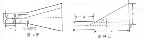 示波管是一种多功能电学仪器,它的工作原理可以用图14甲来说明。图中A、B为偏转电极。真空室中电极K发出电子(初速度不计),经过电压为U1的加速电场后,由小孔S沿水