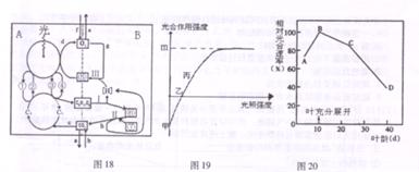 理作用及相互关系的图解,其中①-⑥代表物质,abcdefgh表示生理过程,I~Ⅲ代表B生理作用的反应阶段。图19表示该植物光合作用强度随光照强度的变化曲线。图20表示鸭茅(属多年生草本植物,幼叶成折叠状)相对光合速率(%)与叶龄的关系。请据图分析回答:w.w.^w.k.s.5*