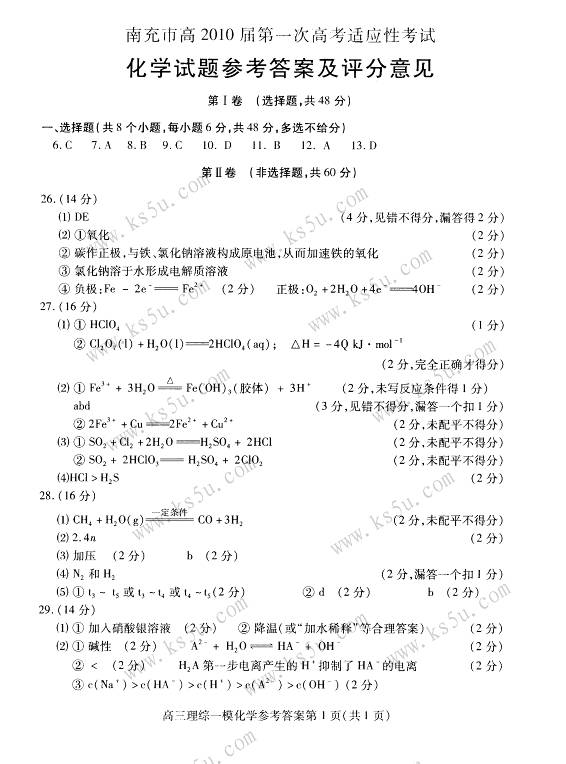 (2)(10分)某二元酸(化学式用H2A表示)在水中的电离方程式是:w.w.^w.k.s.5*