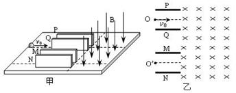 25.(18分)如图甲所示,在光滑绝缘的水平面上固定着两对几何形状完全相同的平行金属板PQ和MN, P、Q与M、N四块金属板相互平行地竖直地放置,其俯视图如图乙所示。已知P、Q之间以及M、N之间的距离都是d=0.2m,极板本身的厚度不计,极板长均为L=0.2m,P、Q之间以及M、N之间的电压都是U=6.0×102V。金属板右侧为竖直向下的匀强磁场,磁感应强度B=5×102T,磁场区域足够大。今有一质量为m=1×10-4kg,电量为q=2×10-6C的带负电小球在水平面上如图从PQ平行板间左侧中点O沿极板中轴线以初速度v0=4m/s进入平行金属板PQ。