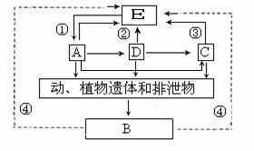 32. (9分) 下图表示生态系统结构模式图,①、②、③、④代表生理过程。据图回答下列问题: