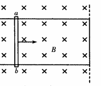 一个匀强磁场区域,磁场方向垂直于水平面,磁感应强度的大小为B,导轨的右边恰在磁场右边界处。现有一位于导轨平面内且与轨道平行的向右方向的拉力作用于金属杆ab上,使之从静止开始在轨道上向右做加速运动。已知拉力的功率恒为P,经过时间t,金属杆在轨道上相对轨道向右滑动的位移为s,此时回路中的电流为I(金属杆还在磁场中)。试求在此过程中金属杆中所产生的电能。重力加速度为g。