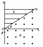 (21分)如图所示,在平面直角坐标系xOy中,直线OA与x轴正方向成θ角。在直线OA和-y轴之间的范围内存在一个垂直xOy平面向外的匀强磁场。在直线OA和+y轴之间的范围内存在一个沿x轴正方向的匀强电场。假设一个静止的原子核在坐标原点O处发生β衰变,其中所产生的β粒子沿y轴负方向运动然后进入磁场,产生的新原子核也能够进入场中。已知产生的新原子核的初速度为v、电荷量为q。电子的电荷量为e。某同学分析,如果调整电强场度或磁感应强度的强弱,使电场强度和磁感应强度的比值为某一个合适的值,则所产生的β粒子和新原子核能够经过直线OA上的同一点P,否则,则不能经过同一点P。请你根据该同学的分析求出该合适的值(二者的重力都不计)。