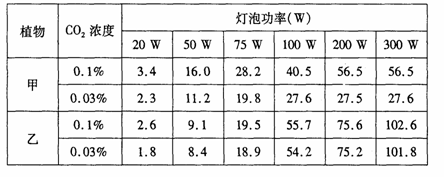 (3)根据表中数据分析,当灯泡为100W、CO2浓度为0.03%时,限制甲植物和乙植物O2释放量的主要外界因素分别是________________,若将CO2浓度提高到0.5%时,你认为对提高__________植物的O2释放量更有利。