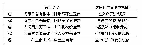 5.古代诗文中蕴含着一定的科学知识,如“螳螂捕蝉,黄雀在后”揭示了生物之间的营养关系,下表中的诗文与所蕴含生命科学知识的对应关系正确的是