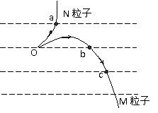图中虚线为匀强电场中与场强方向垂直的等间距平行直线,两粒子M、N质量相等,所带电荷的绝对值也相等,现将M、N从虚线上的O点以相同速率射出,两粒子在电场中运动的轨迹分别如图中两条实线所示。点a、b、c为实线与虚线的交点,已知O点电势高于c 点。若不计重力,则