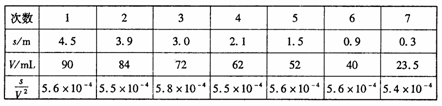 (2)下表是该小组测得的有关数据,其中s为滑块从斜面的不同高度由静止释放后沿斜面下滑的距离,V为相应过程中量筒中收集的水量。分析表中数据,根据___________,可以得出滑块沿斜面下滑是做匀变速直线运动的结论。