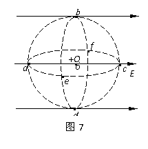 18、如图7所示匀强电场E的区域内,在O点处放置一点电荷 +Q, a、b、c、d、e、f为以O点为球心的球面上的点,aecf平面与电场平行,bedf平面与电场垂直,则下列说法中正确的是 ( )