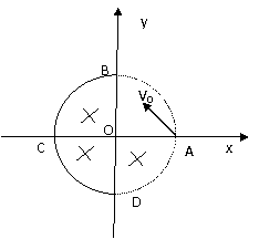 23、在以坐标原点O为圆心、半径大小未知的圆形区域内,存在磁感应强度大小为B、方向垂直纸面向里的匀强磁场,如图12所示,一个不计重力的带正电粒子从磁场边界与x轴的交点A处以速度v沿与x轴负方向成45度的方向射入磁场,经磁场偏转后沿与射入方向相反的方向射出磁场。已知带电粒子的质量为m,电量大小为q。