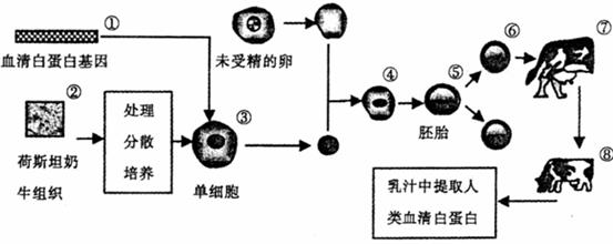 现代生物科学技术,将人的血清白蛋白基因专入奶牛细胞中,那么利用牛的乳汁生产血清白蛋白就会安全、高效地满足人类需求。下图是利用牛奶乳汁生产人类血清白蛋白的图解,根据下图回答: