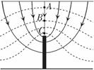 在 M、 N两条长直导线所在的平面内,一带电粒子的运动轨迹如下图所示。已知两条导线M、N只有一条中有恒定电流,另一条导线中无电流,关于电流、电流方向和粒子带电情况及运动方向,可能是