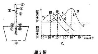 3.题3图甲图是一株盆栽植物,乙图表示该植物不同器官对生长素浓度的反应,下列相关叙述正确的是 ( )