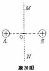 20.如题20图所示,在光滑绝缘水平面上有A、B两个固定的带等量正电荷,O为两电荷连线中点,MN为过O点垂线。一个负电荷q由MO线上C点(图中未画出)从静止释放。下列关于负电荷运动的说法正确的是 ( )