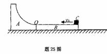 25.(19分)如题25图所示,在光滑水平面上静止有质量均为M的滑槽A和木板B,木板B上表面粗糙,滑槽A上有光滑的1/4圆弧轨道,其圆弧轨道O点切线水平且与木板B上表面相平,A、B靠在一起,一可视为质点的物块C,质量为m,且