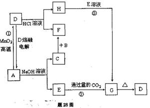 28.(16分)A、B、C均是由短周期元素组成的单质,D、E、F、G、H均为化合物,F在常温常压下为液态,它们有下图所示的转换关系。