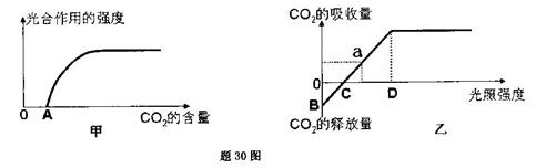 II.(14分)下面的甲、乙两图反映了二氧化碳含量和光照强度对绿色植物光合作用的影响。请据图回答: