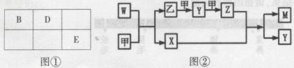 30.(12分)A、B、D、E四种元素均为短周期元素,原子序数逐渐增大。A元素原子的核外电子数、电子层数和最外层电子数均相等。B、D、E三种元素在周期表中相对位置如图①,只有E元素的单质能与水反应生成两种酸。甲、乙、M、W、X、Y、Z七种物质均由A、B、D三种元素中的一种或几种组成,其中只有M分子同时含有三种元素;W为A、B两元
