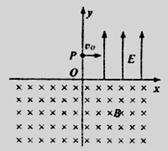 (21分)如图,在xoy平面内,Ⅰ象限中有匀强电场,场强大小为E,方向沿y轴正向,在x轴下方有匀强磁场,磁感强度大小为B,方向垂直于纸面向里。今有一个质量为m电量为e的电子(不计重力),从y轴上的P点以初速度