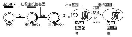 5.ch1L基因是蓝藻拟核DNA上控制叶绿素合成的基因。为研究该基因对叶绿素合成的控制,需要构建该种生物缺失ch1L基因的变异株细胞。技术路线如下图所示,对此描述错误的是: