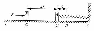 25. (18分)如图所示,EF为水平地面,O点左侧是粗糙的、右侧是光滑的。一轻质弹簧右端与墙壁固定,左端与静止在O点质量为m的小物块A连结,弹簧处于原长状态。质量为m的物块B在大小为F的水平恒力作用下由C处从静止开始向右运动,已知物块B与地面EO段间的滑动摩擦力大小为