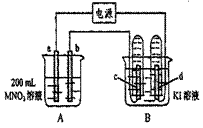 (2)电解开始时,在B烧杯的中央,滴几滴淀粉溶液,你能观察到的现象是: ,电解进行一段时间后,罩在c极上的试管中也收集到了气体,此时c极上的电极反应为 .