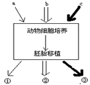 5、动物细胞培养是动物细胞工程的基础,如右图所示,a、b、c 表 示现代工程技术,①、②、③分别表示其对应的结果,请据图回答下面说法正确的是