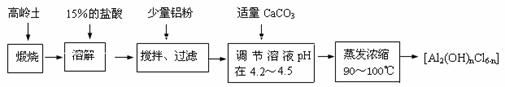聚合氯化铝的单体是液态的碱式氯化铝[Al2(OH)nCl6-n]。其制备原料为高岭土,化学组成:Al2O3(25%-34%)、SiO2(40%-50%)、Fe2O3(0.5%-3.0%)以及少量杂质和水分。制备流程如下: