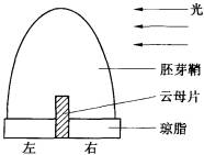5.将燕麦胚芽鞘尖端放在琼脂小块上,正中插入生长素不能透过的云母片,琼脂被分成相等的两部分(见下图)。单侧光照射后,琼脂内生长素含量